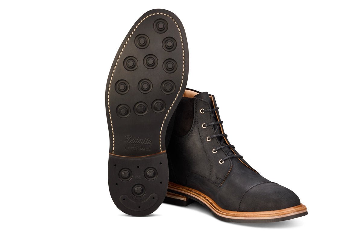 We have kept this version super simple, the upper is made from Black Waxy Commander and features a Black Suede Collar, Silver eyelets, a natural edge finish and a dainite sole for all surfaces and terrains.